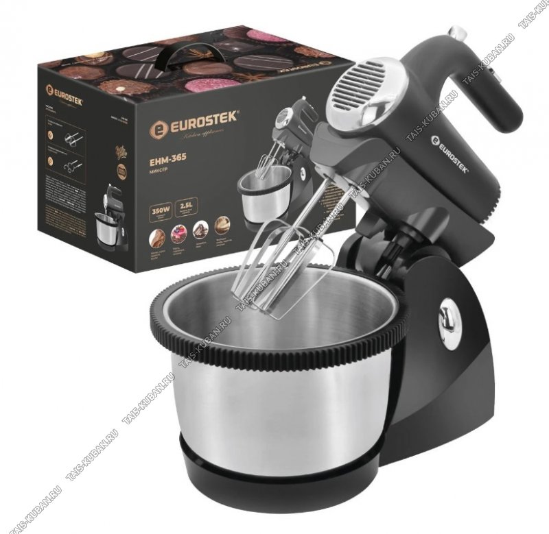 Мощность 350 Вт; 5 скоростей; Вращающаяся металлическая чаша 2.5л; 2 хромированных венчика для взбивания яиц и крема; 2 хромированных крюка для замешивания теста