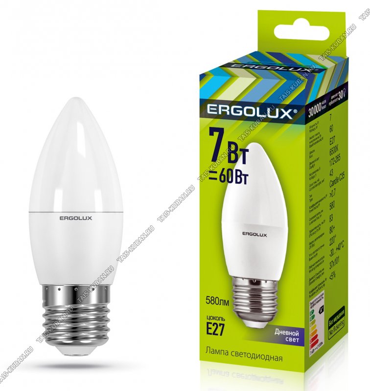 Ergolux-Свеча E27 7Вт,дневн.6500Вт,светов.поток 680Лм (аналог 60Вт обыч.лампы) h101 d37мм (25)