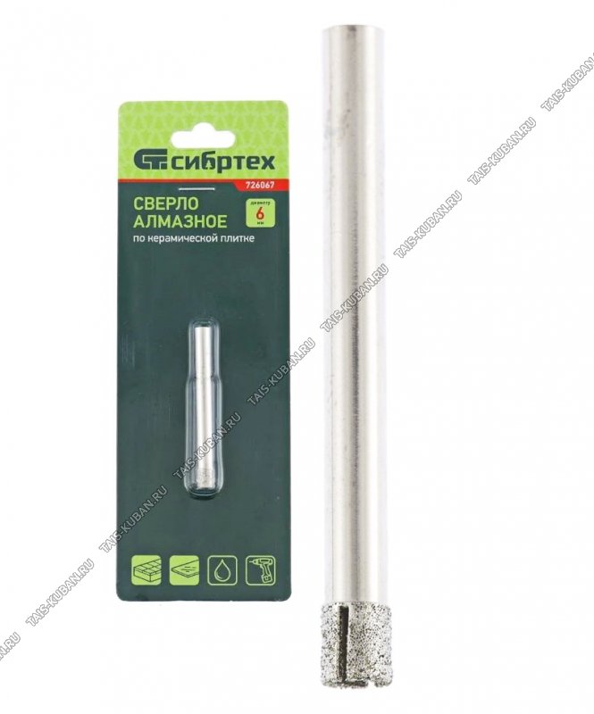 Сверло по стеклу и керамической плитке 6мм, цилиндрический хвостовик,блистер (60)