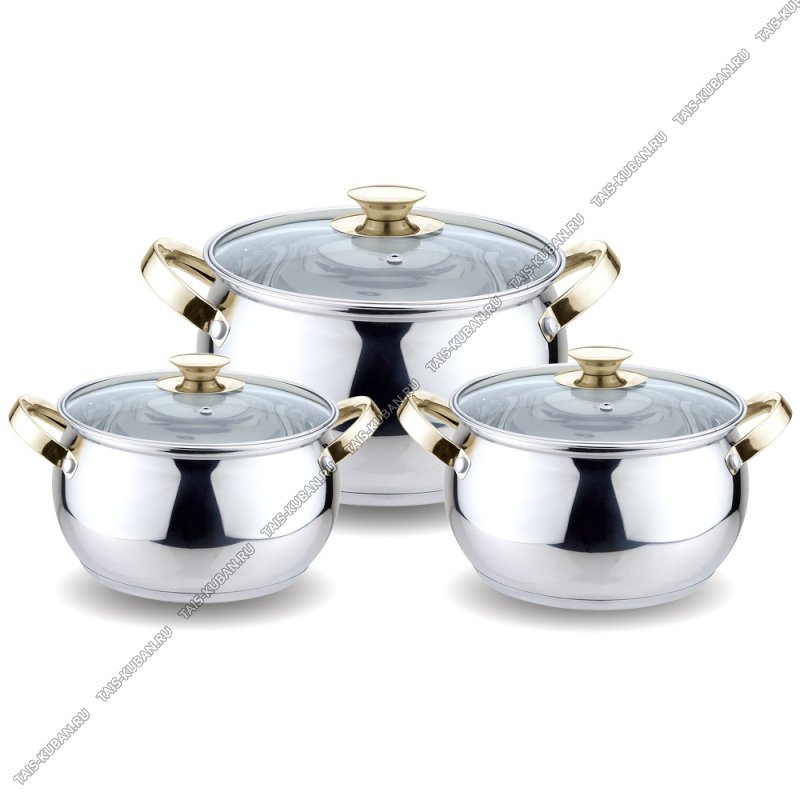 Набор кастрюль 3шт (бочка 2,1/3,0/4,0л d16/18/20см),стеклянная крышка,индукционное дно,металлические ручки "золото",зеркальная полировка,подарочная упаковка (4)