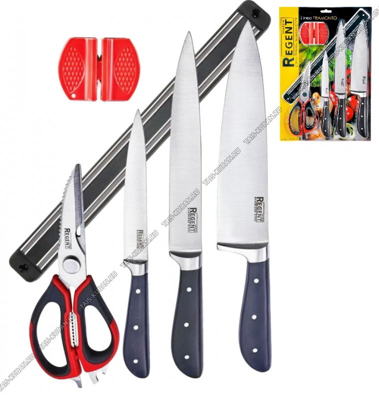 (ножи разделочный 20см/универсальный 13см/поварской 20см,магнитный держатель L33см,точилка,ножницы) лезвие нержавеющая сталь 3Cr13,черная бакелитовая ручка,блистер,Regent