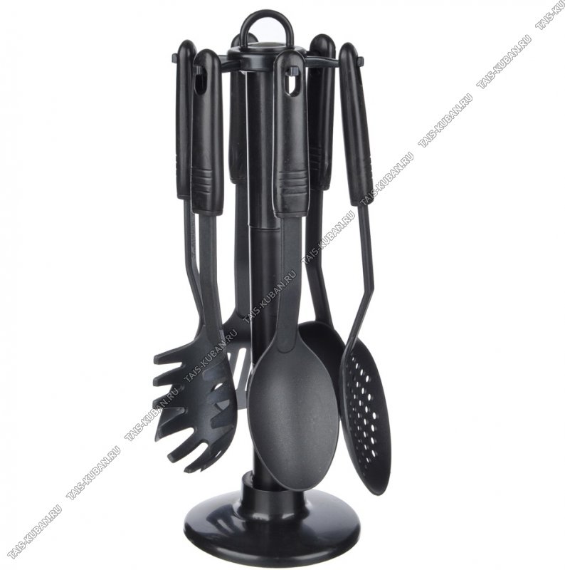 Кухонный набор 6 предметов на подставке "Блэк"(лопатка с прорезями,половник,ложка поварская,шумовка,лопатка,ложка для спагетти),нейлон,черный,подарочная упаковка(2)