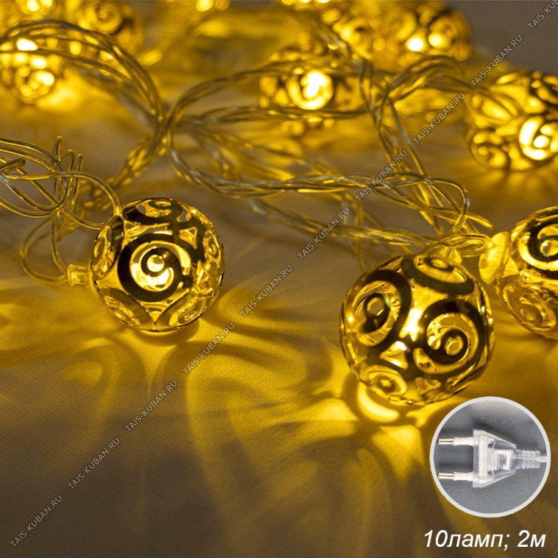 Электрогирлянда "Нить/Золотые шары" L2м, 10тепл.LEDламп, прозрач.провод,220V (100)
