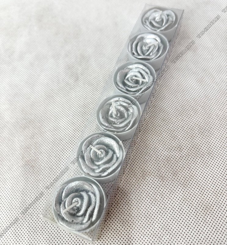 Свеча (парафин) чайная н-р 6шт "Роза серебро" d4см,блестки, п/у