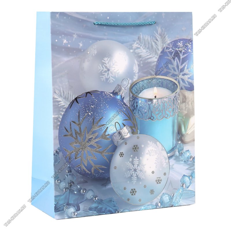 Пакет бумажный (h32х26см, дно10см) "Серебристый Новый Год/Свеча и шары" с блестками (12)