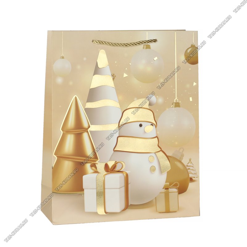 Пакет бумажный (h32х26см, дно10см) "Шары, подарки и елка/Снеговик и елки" (12)