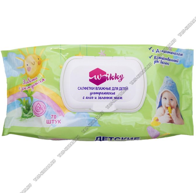 Влажные салфетки детские. 70шт,с крышкой "Алоэ и зеленый чай" пантенол,без спирта,ультрамягкие