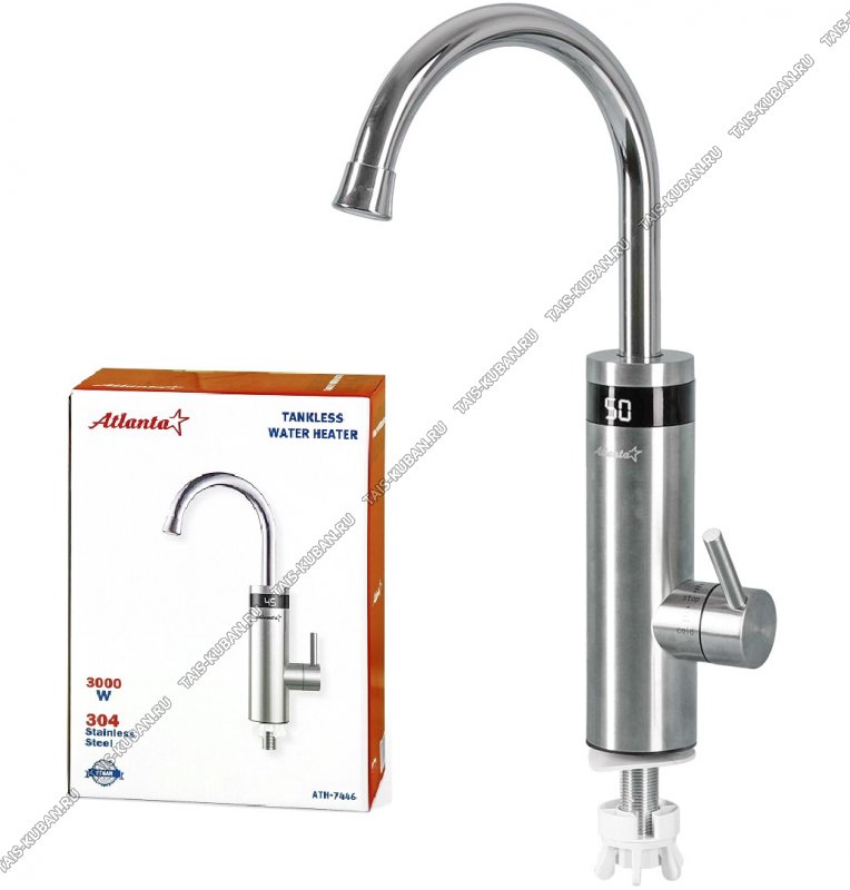 Водонагреватель "проточный" 3000Вт, корп.нерж.сталь, LED дисплей,высок.излив,мгновен.нагрев 30-50°C,защ.от сухого включ,защ.от перегрев,кабель 140см 220В, серебро (10)
