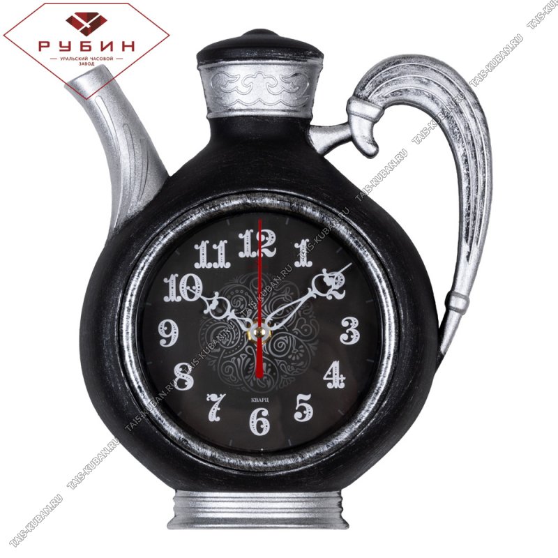 Часы (пластик) фигурные (27х24см) "Чайник" черный/серебро