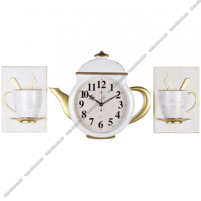 Часы (пластик) 3 секции (29х34см+2чашки) Часы (пластик) 3 секции (29х34см+2чашки) "Чайник" белый с золотом
