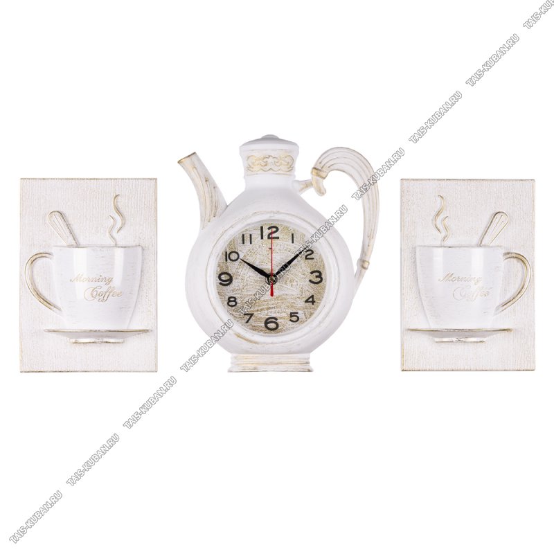 Часы (пластик) 3 секции (29х34см+2чашки) Часы (пластик) 3 секции (29х34см+2чашки) "Чайник" белый с серебром