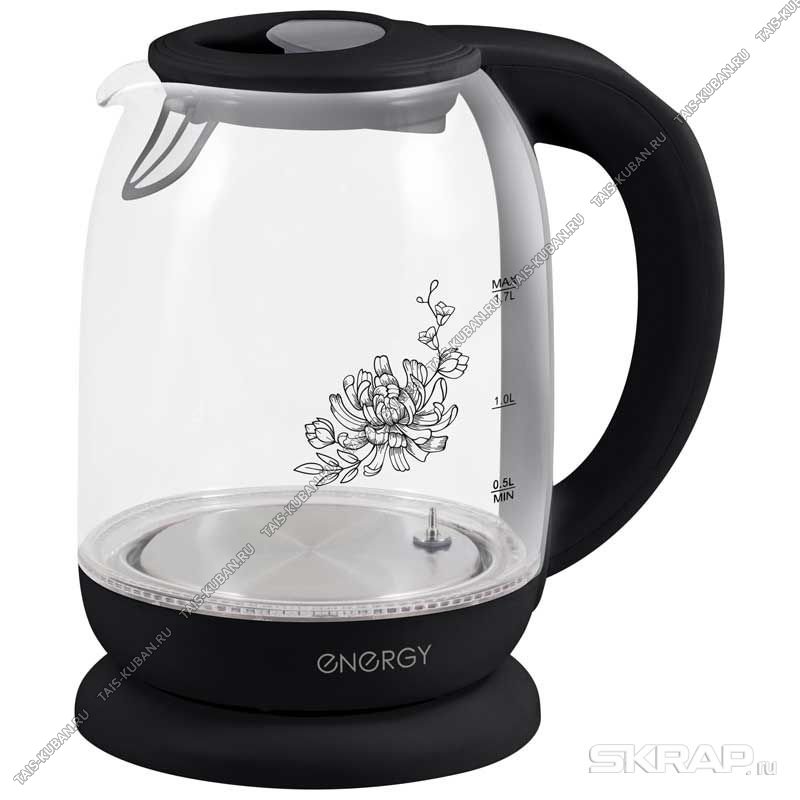 Чайник стекло 1,7л 2200Вт диск,5 t реж.(60-100`) внутр.подсвет.(цв.зависит от t) защита б/воды, автооткл, рис.на корп. (6) ENERGY
