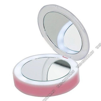 Зеркало косметическое кругл, LED подсв, d8,5см, кноп вкл/выкл, регул.подсв, 2зеркала d6,5см, пит.2хААА, цв.бел-роз