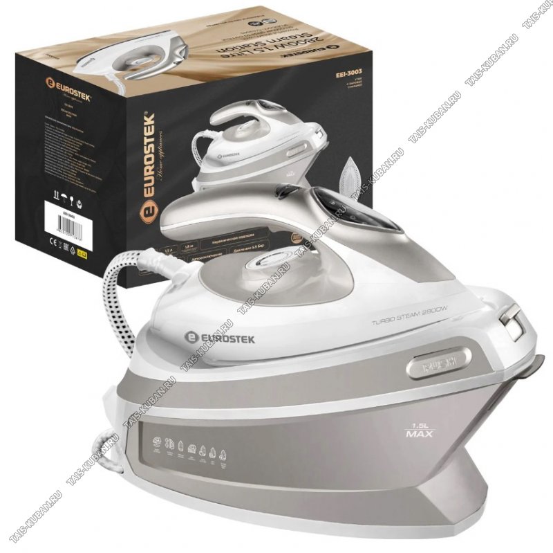 Утюг Eurostek с паровой станцией EEI-3003Мощность 2800Вт, Сух. глаж/пар/паровой удар, Механическое упр. температурой, керамическая подошва, Функция Anti-calc, Емкость резервуара для воды: 1500 мл, Длина кабеля: общая 1,8 м , Давление пара: 5,5 баррр, Скорость подачи пара: 135 гр/мин, Система самоочистки, Автоматическое отключение, Наличие хранилища для шнура, Светодиодный дисплей, Сенсор пара