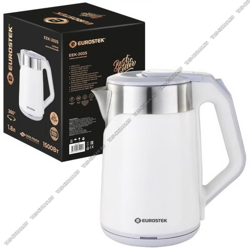 Чайник электрический «Eurostek» EEK-2025, 1500 Вт, Объем 1.8 л , Двойной корпус из нержавеющей стали и пластика, кнопка открывания крышки, шкала уровня воды, дисковый нагревательный элемент, световая индикация работы, вращения чайника на подставке наааа 360, автоматическое отключение при закипании и при недостаточном количестве воды.