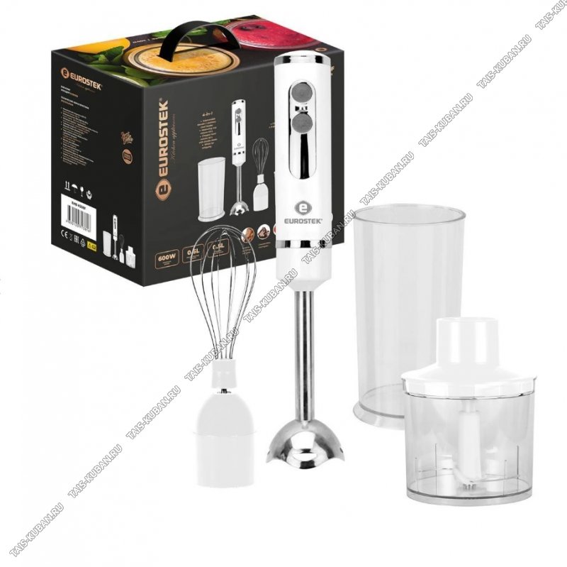 Блендер погружной Eurostek EHB-KS08FМаксимальная мощность: 600 ВТ, 2 скорости, объем измельчителя: 500 мл. Материал чаши - пластик, Материал венчика, погружного блендера с лезвием - нержавеющая сталь; объем мерного стакана: 600 мл, корпус из прочннннннного пластика. защитный замок, цвет белый