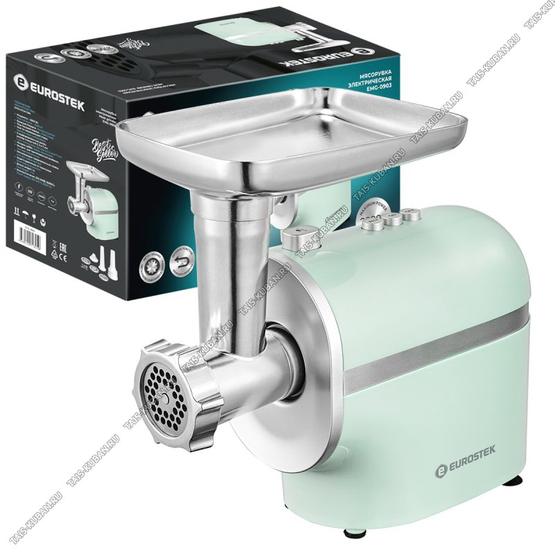 Мясорубка электрическая Eurostek EMG-0903. Мощность 2000Вт, пластиковый корпус, функция Реверс, нож и диски из нержавеющей стали, перфорированные диски для мяса, размер отверстий 3, 5, 7 мм, насадка Кеббе, насадка для приготовления колбасок, противоскользящие ножки, Защита двигателя от перегрузки, длина шнура 1м