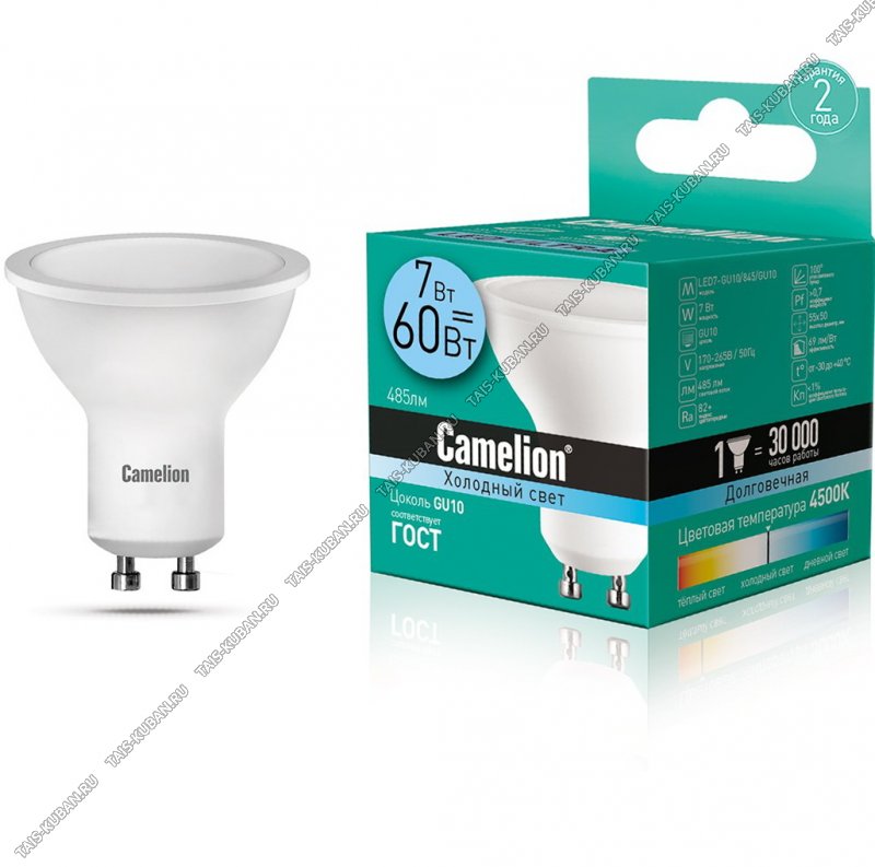 Camelion GU10 7Вт,холод.4500Вт,светов.поток 495Лм (аналог 60Вт) d50 h55мм (10)