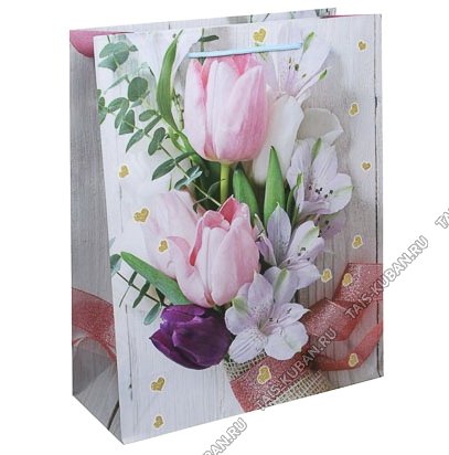 Пакет бумажный (h32х26см, дно10см) "Тюльпаны и фрезии/на на белом" (12)