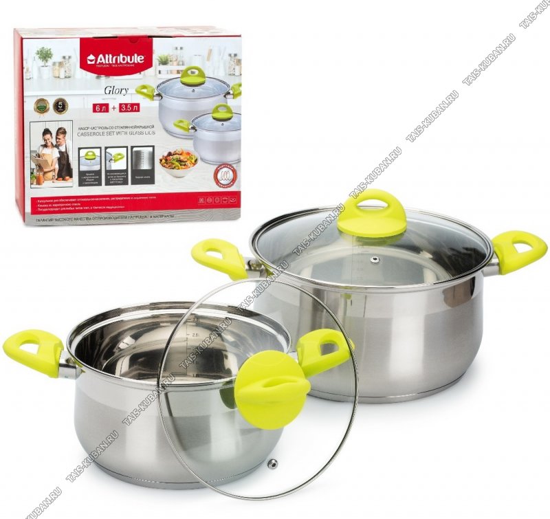 форма бочка,стеклянные крышки,индукционное дно,шкала литража,металлические ручки с силиконовым покрытием,цвет ручек салатовый,комбинированная полировка,подарочная упаковка,Attribute