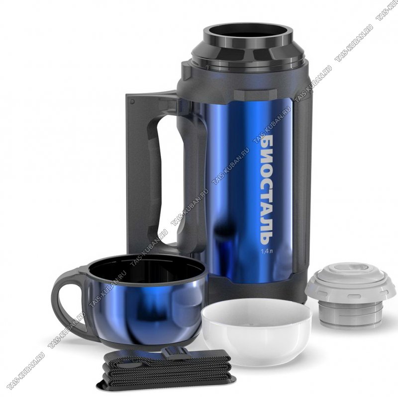 Термос (суповой) "Авто" 1,4л синий металлик,крышка-чашка+доп.чашка,пробка с кноп,пласт.склад.ручка и ремешок