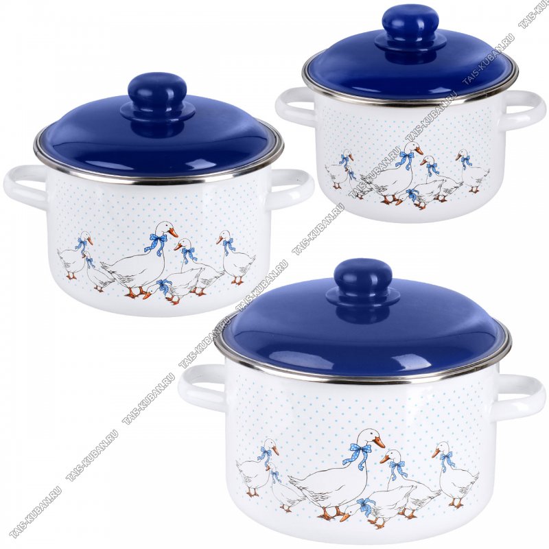 Гуси Набор 3предмета (кастрюли 2,0/3,0/5,5л) металлическая синяя крышка,белая эмаль,пластиковая ручка/кнопка (цилиндр)