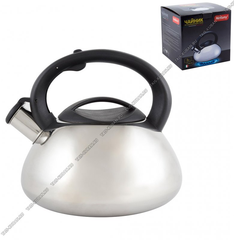 Чайник нерж 3,0л свист,цельнолитое индукц.дно,ручка пласт.черн.с кнопк.д/открыван,зеркал.полиров,п/у (6)