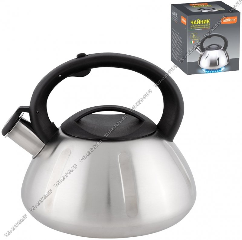 Чайник нерж 3,0л свист,цельнолитое индукц.дно,рельеф.корпус,ручка пласт.черн.с кнопк.д/открыван,матов,п/у (6)