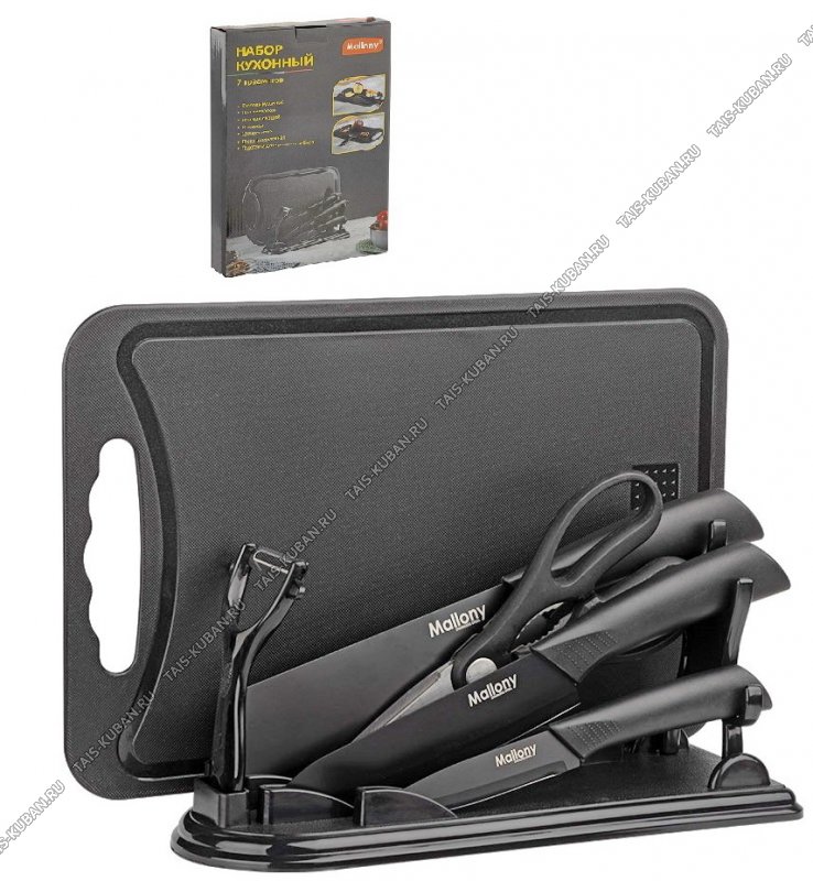 (ножи поварской L15/д/овощей L9,5/топорик кухонный L15,5см+ножницы+овощечистка L12,5х8см+доска разделочная пластиковая 32,5х22см) лезвие нержавеющая сталь толщиной 1,5мм,черный,подарочная упаковка,Mallony