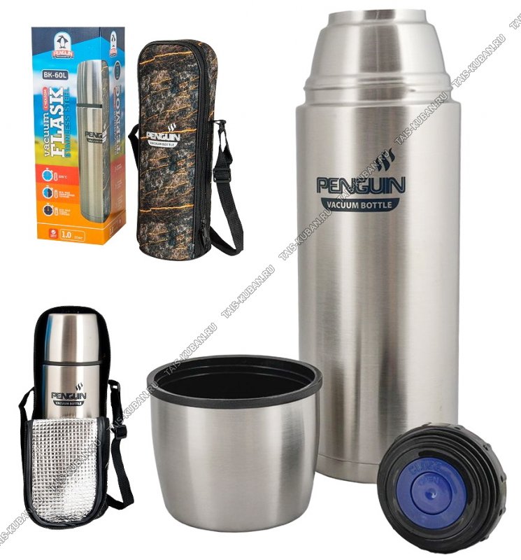 Термос "Penguin" 1,2л винтов.пробка-кнопка,крышка-чашка,теплоизоляц.чехол,ремень,п/у (20)