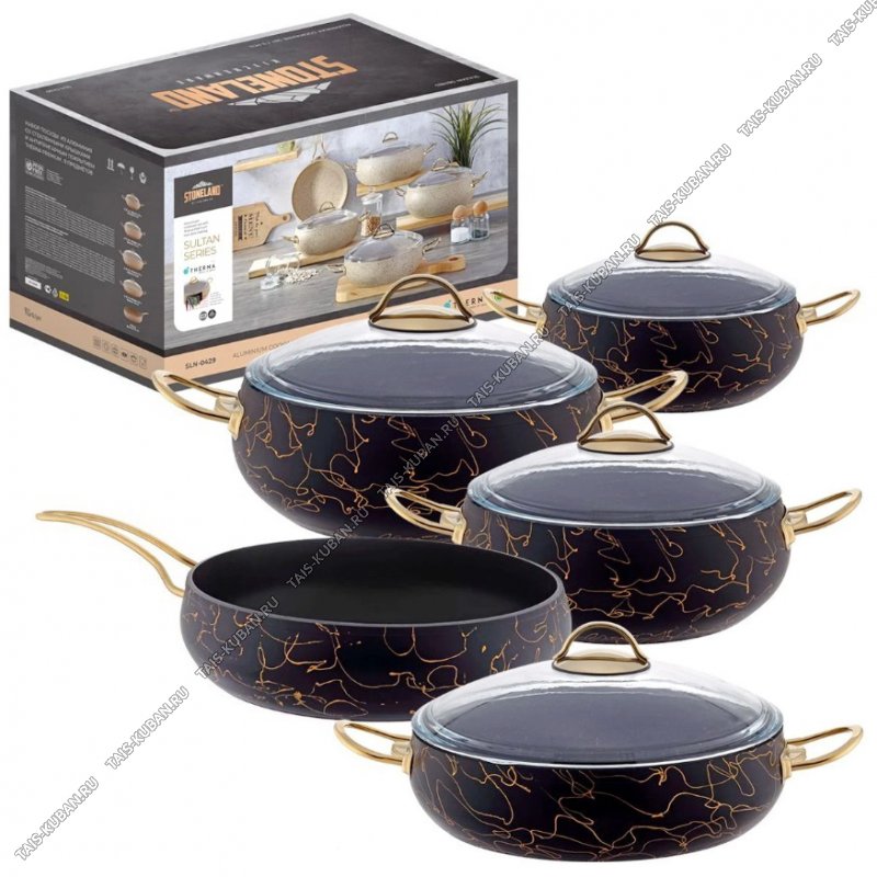 (кастрюли с крышками 2,5/4,5/6,5л d20/24/28 h9/10/12см,жаровня с крышкой 3,5л d28 h7,5см,сковорода 3,5л d28 h7,5см),толщина стенки 4мм,индукционное дно,металлические ручки "золото",антипригарное покрытие Therna premium,подарочная упаковка