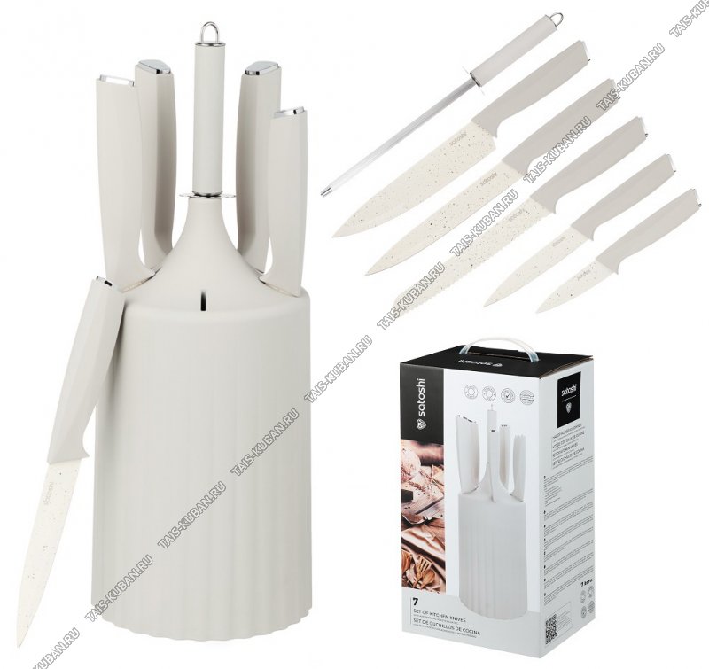 (шеф-нож 20см/д/хлеба 19см/универсальный 13см и 15см/д/овощей 9см,мусат д/заточки) лезвие нержавеющая сталь3Cr13,кремовый с черным крапом,пластиковые ручки,пудрово-серый,подарочная упаковка,Satoshi