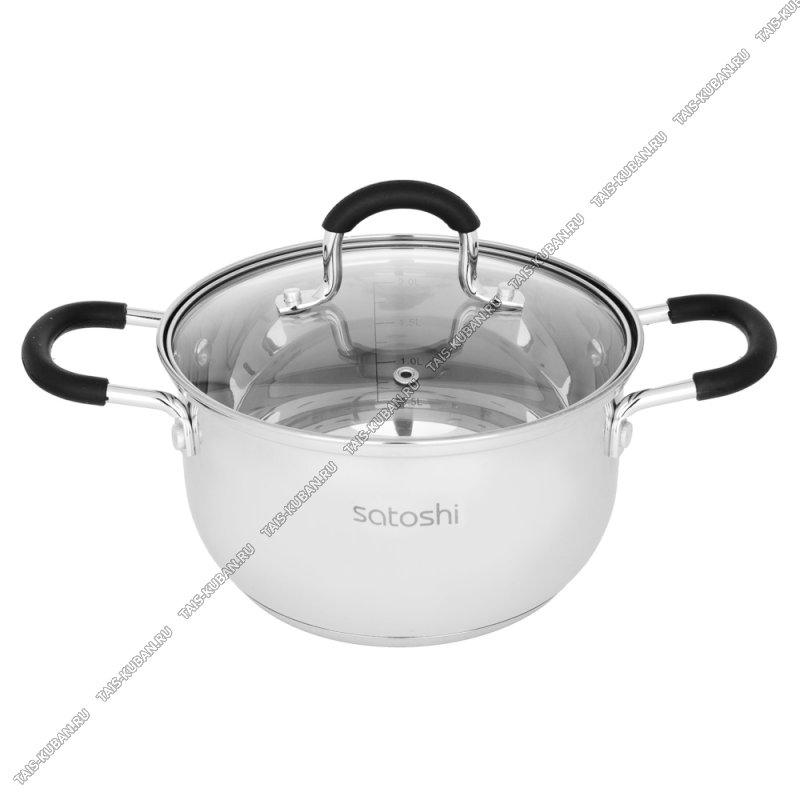 форма цилиндр,индукционное капсульное дно,ручки-дуги цельные металл/силикон черный,стеклянная крышка ручка-дуга цельная металл/силикон черный,зеркальная полировка,толщина стенки/дна 0,5/3,0мм,подарочная упаковка,Satoshi
