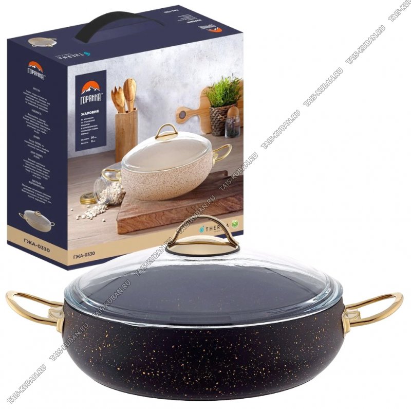 овальный борт h8см,ручки-дуги металл "золото",стеклянная крышка литая,ручка-дуга металл "золото",толщина стенки 4мм/дна 4,0мм,кованый алюминий,подарочная упаковка,Горянка