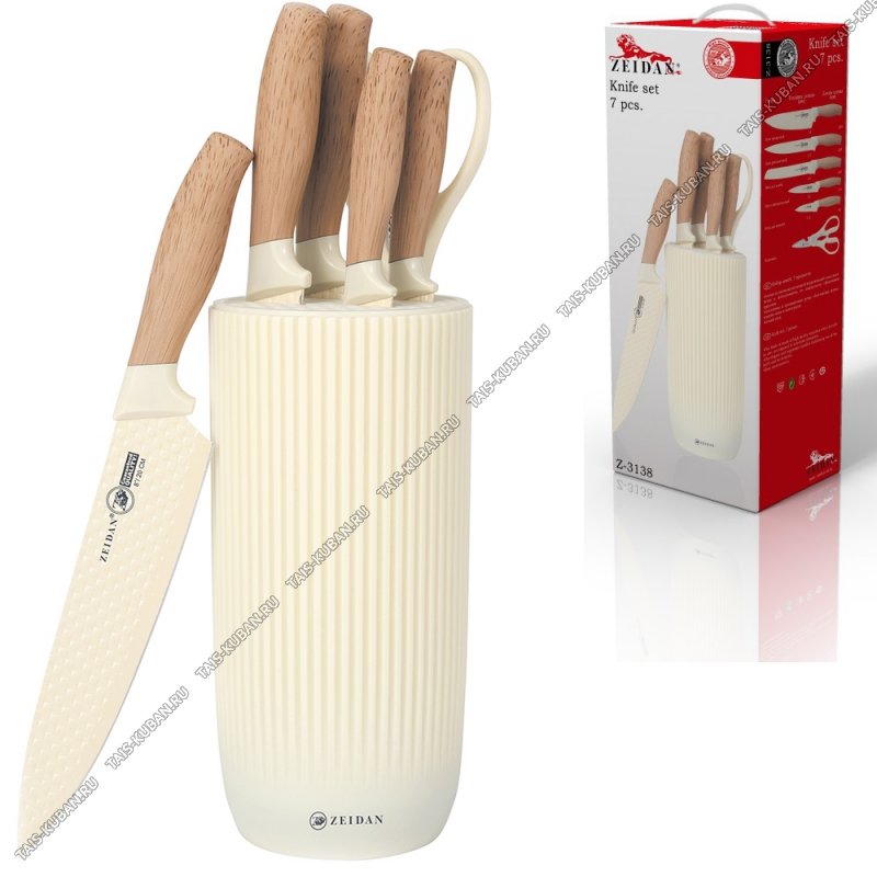 цвет айвори,(ножи поварской 20/д/хлеба 20/универсальный 13/разделочный 20/д/овощей 9см,ножницы) нержавеющее лезвие с эффектом "плетения",прорезиненные ручки "дерево",подарочная упаковка,Zeidan