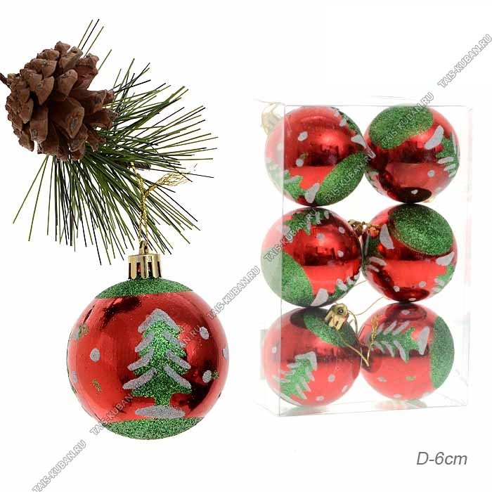 Ёлочный шар н-р 6шт d6см зелено-красные "Елочка" пластик п/у (120)