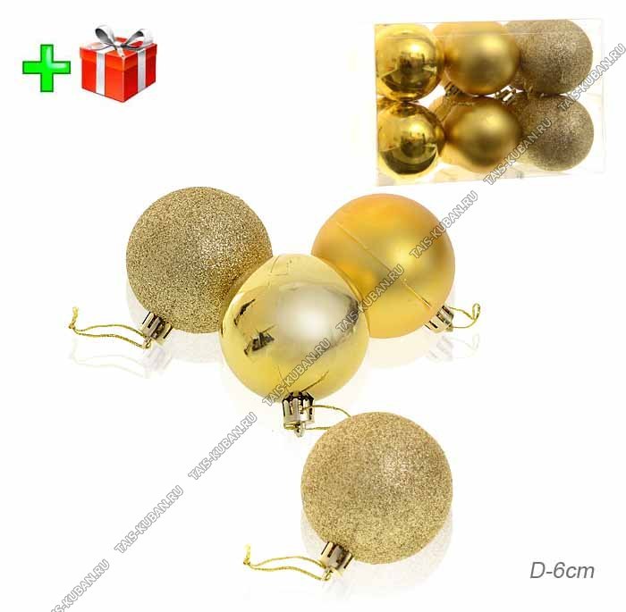 Ёлочный шар н-р 6шт d8см, золото Ёлочный шар н-р 6шт d8см, золото "Ассорти" пластик п/у (64)