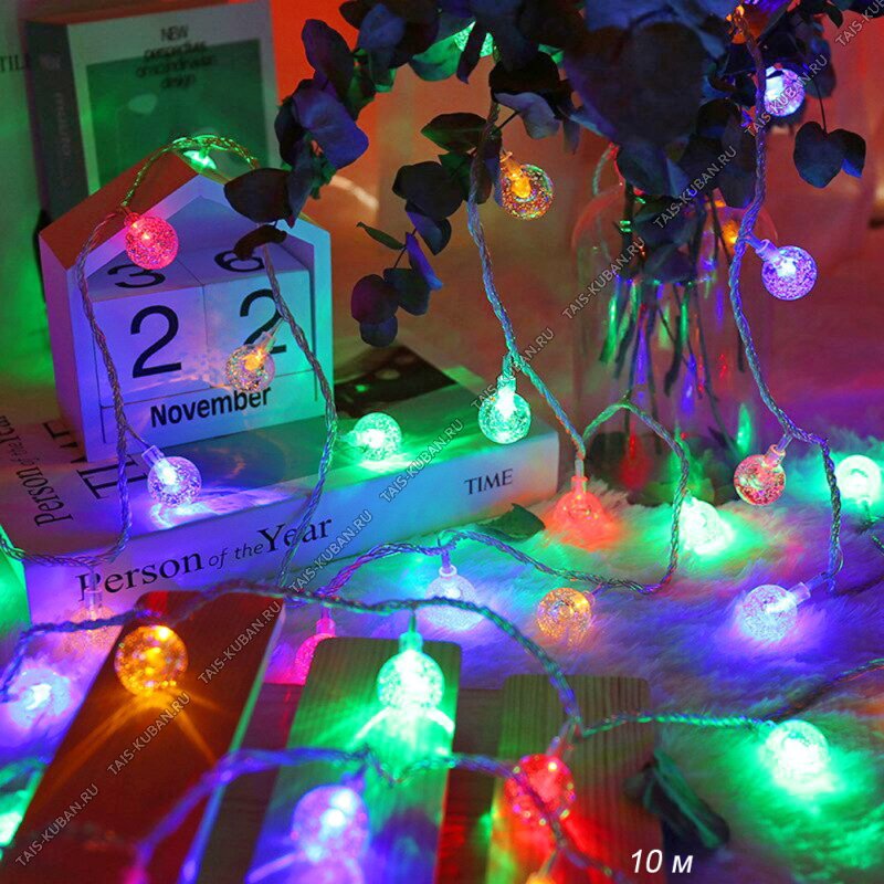 Электрогирлянда "НИТЬ/Хрустальные шарики" L10м, 100разноцв. LEDламп,8режим,прозр.провод, 220V п/у (50)