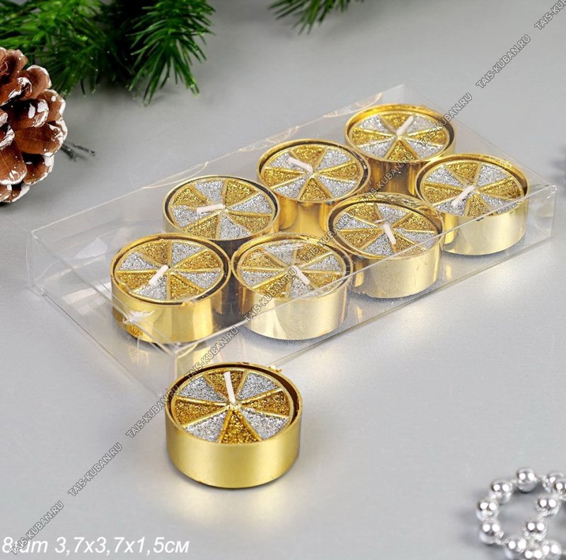 Свеча (парафин) чайная н-р 8шт "Мозаика" d4см, золот/сереб,блестки, п/у