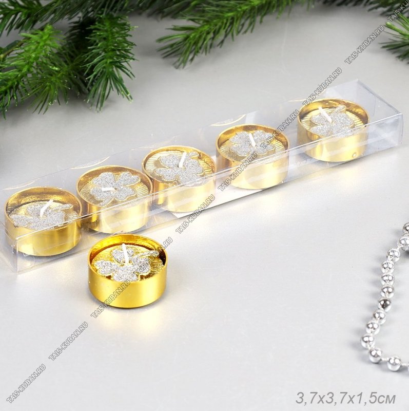 Свеча (парафин) чайная н-р 6шт "Клевер золотой" d4см,блестки, п/у