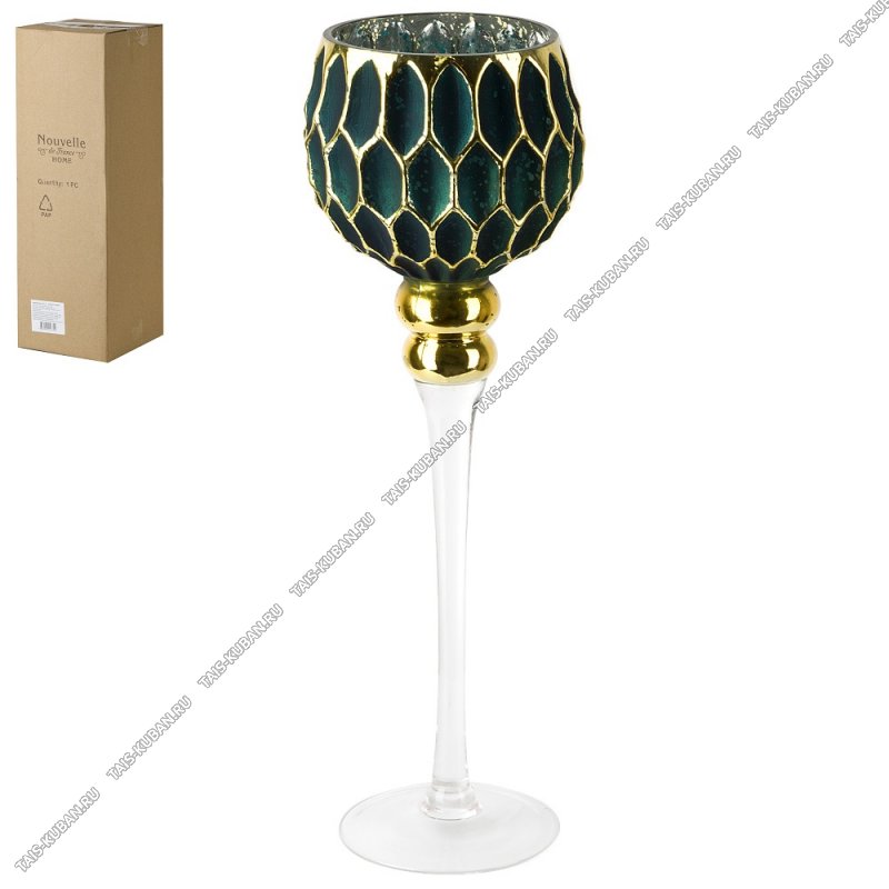 Подсвечник-бокал (стекло) на высокой ножке h40см "Massimo/Зеленый-золото" на высокой ножке h40см (чаша d10,5 h11см)