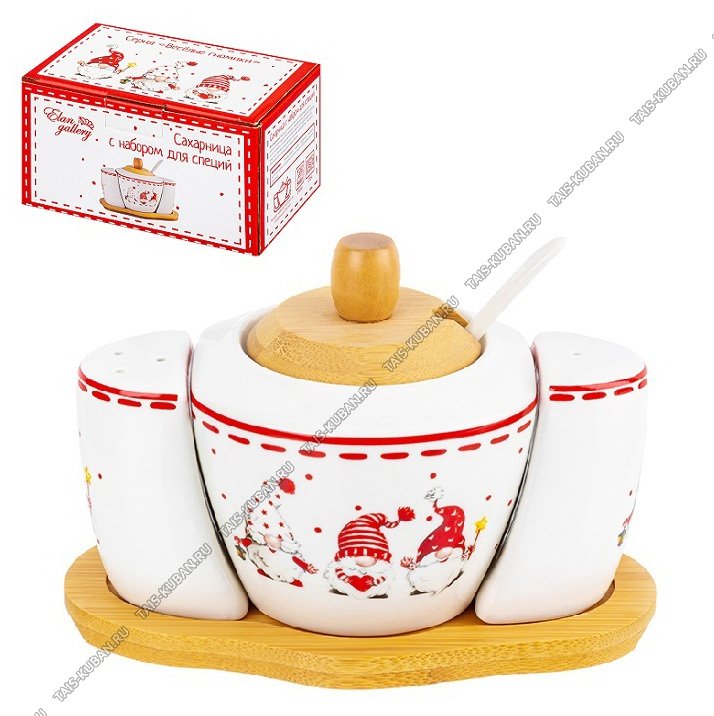 Веселые гномики Набор для сервировки (сахарница с ложкой 300мл,деревянная крышка/солонка+перечница 40мл/деревянная подставка) (24)