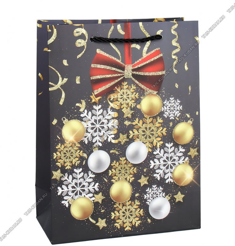 Пакет бумажный (h32х26см, дно10см) Пакет бумажный (h32х26см, дно10см) "Ночь перед Новым Годом/Золотой шар" с блестками (12)