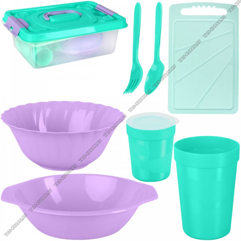 Набор д/пикника 4 перс. 28пр, бирюза+сирень (стаканы 0,25л 4шт,вил 4шт,ложка 4шт,тар.глуб 0,7л 4ш,салат.0,5л 4шт,доска разделоч,стопки 4шт,солонки 2шт, контейнер 6л) Альт Пласт (18)
