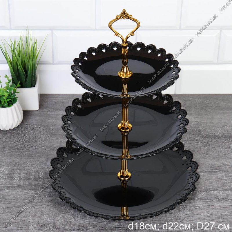 Фруктовница 3-х яр, кругл (d18/22/27 h35см) "Кружево/Черный" резной край,золот.креплен (75)