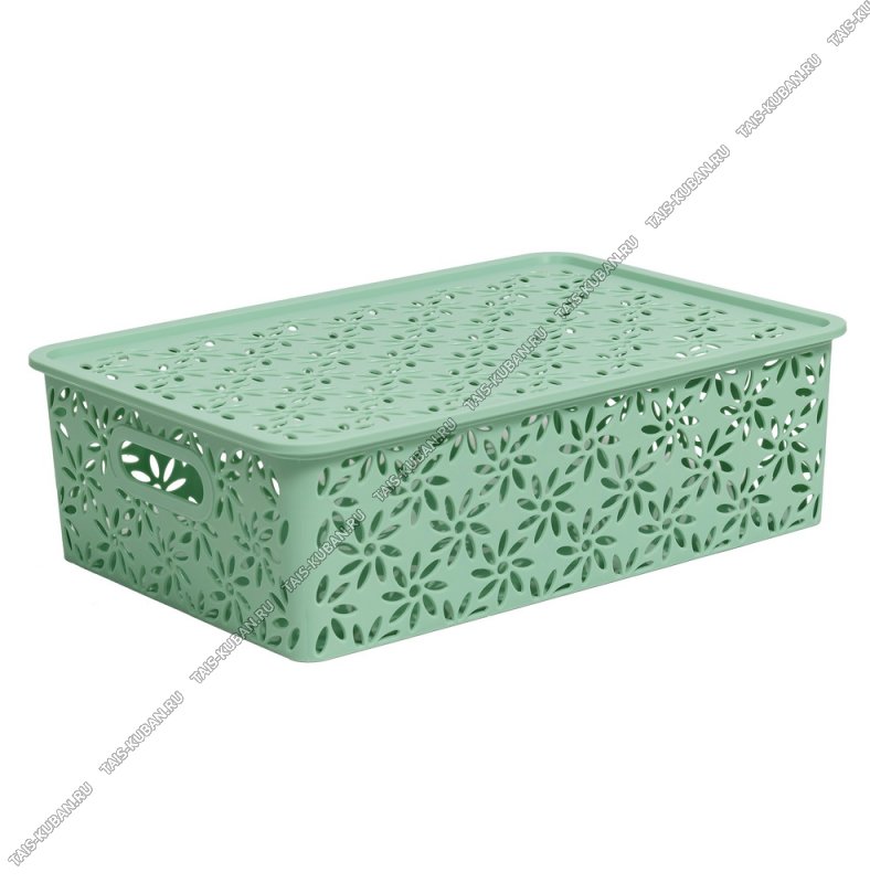 Корзина "Ромашки" пудр.зелен, с крышк 7,5л,прям.(35х24 h10см) выруб.руч.(12)