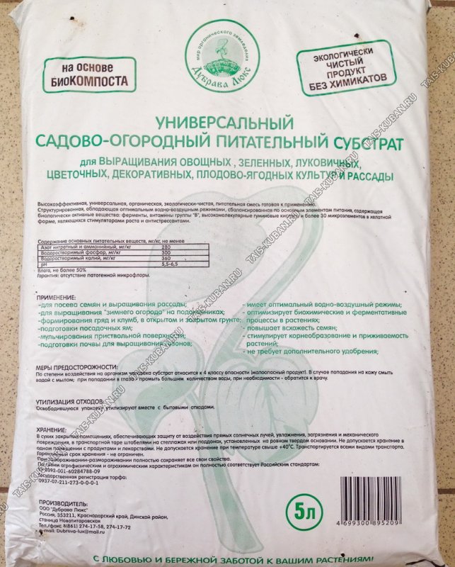(садово-огородный питательный субстрат для овощей,зеленых,луковичных,цветочных,декоративных,пладово-ягодных и рассады)Состав: торф верховой сфагновый , песок, БИО-удобрение "Дубрава".