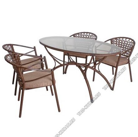 НАБОР мебели 5пр."Сочи" коричн Стол +Кресло 4шт, мягк.сидения (овал 161х68 h78см/64х62 h79см) металл каркас,столешн-тонир.стекло,оплетка искуст.ротанг (1)