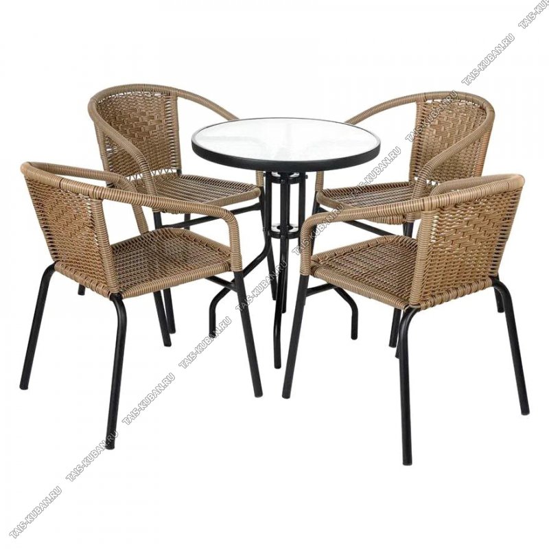 НАБОР мебели 5предмета "Terazza" светло-коричневый Стол +Кресло 4шт (d60 h70см/55х45 h75см) столешница-стекло