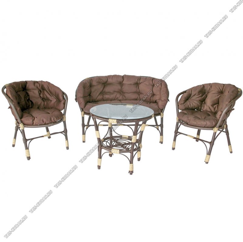 НАБОР мебели 4предмета"Багама" коричневый Стол +Кресло 2шт +Диван 2-х местный, мягкие подушки (d60 h55см/71х70 h73см/115х70 h73см) столешница-стекло